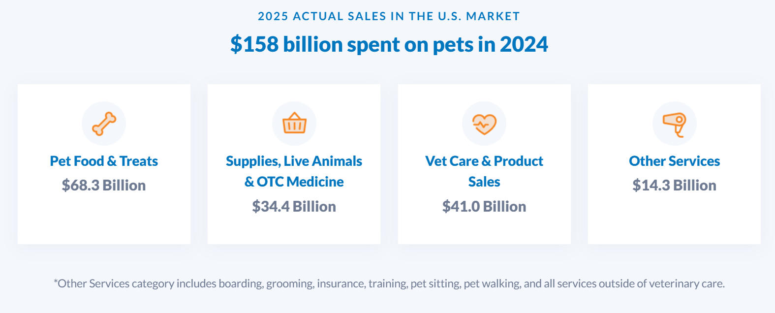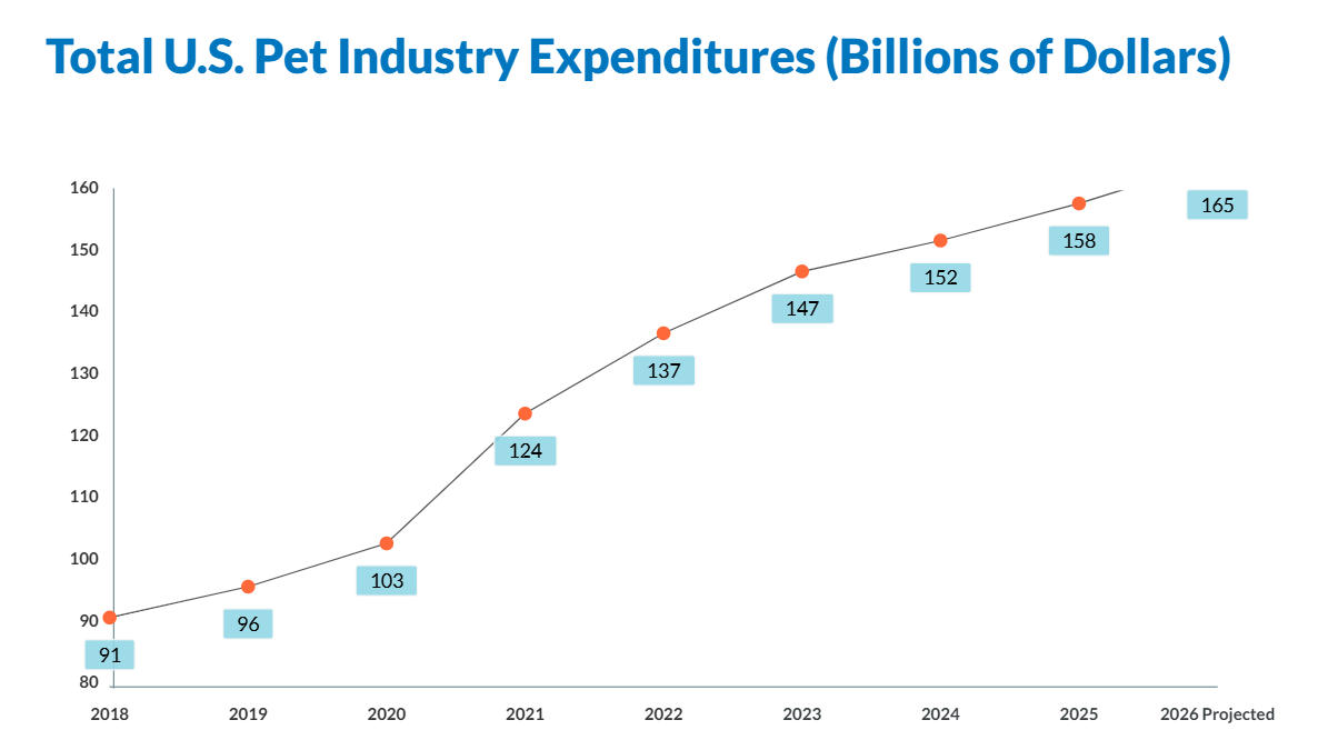 From $90.5 billion in 2018 to $158 billion in 2025, the industry nearly doubled in seven years. Even during economic fluctuations, pet spending remained rigid, reinforcing the long-term trend of pets becoming full-fledged family members.