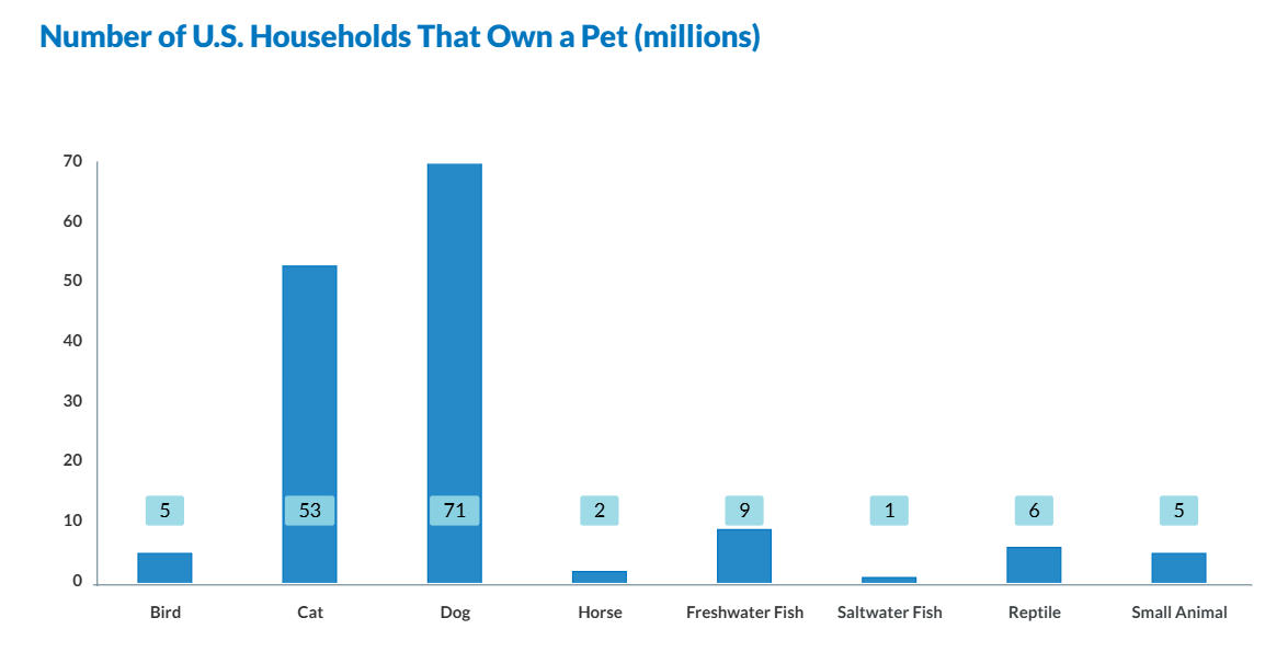 - Dogs: 71 million households (53% of U.S. households), adding ~4 million new homes